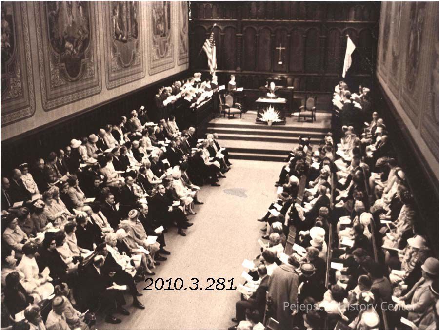 A B/W photograph of the interior of King Chapel, Bowdoin College. Written on the back of the photo, "Dr. Cummins." No clipping. UndatedCollection