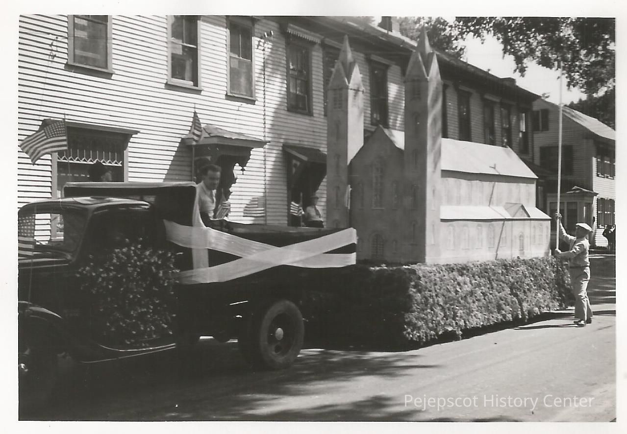 A B/W photo of Bowdoin College's float of King Chapel in Brunswick's 200th Anniversary parade. Undated