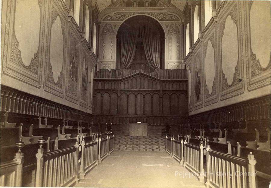 An undated black & white photo of the interior of King Chapel on Bowdoin College's campus in Brunswick, Maine.