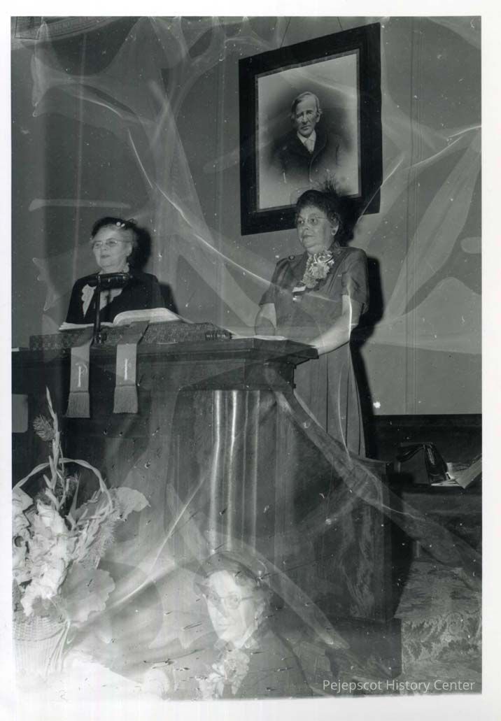 Two Harpswell women are standing behind a podium at the Kellogg Church at Harpswell Center as participants in a meeting of the King's Daughters.