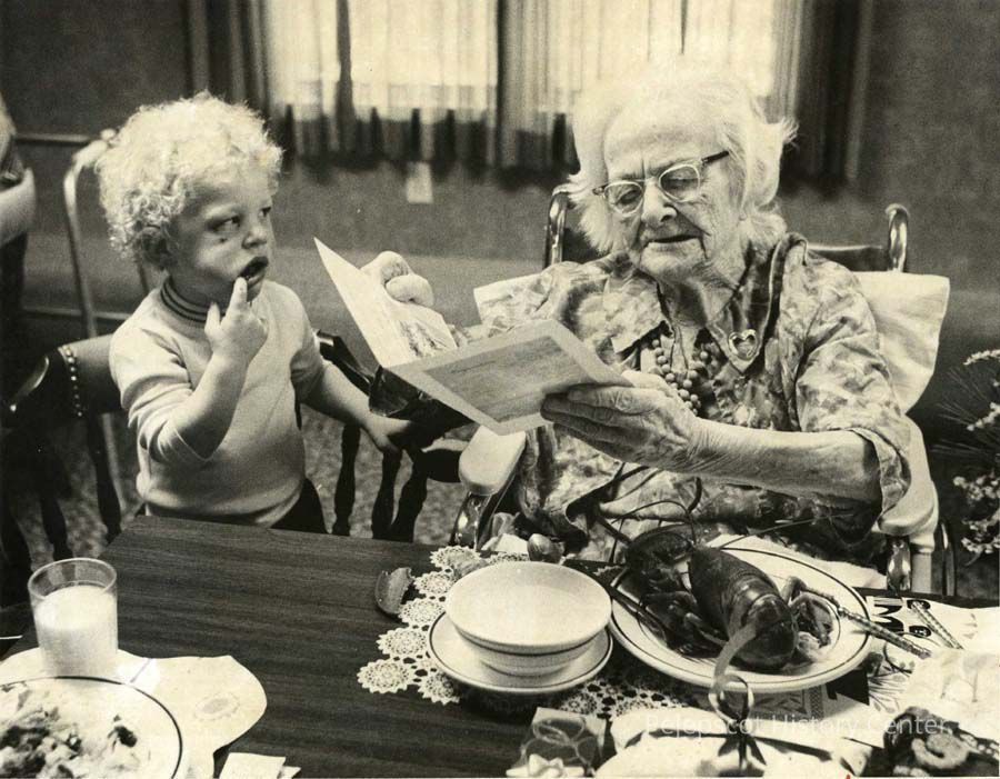 A black and white photo of an unidentified child with Kitty Hamilton of Topsham, Maine, was taken in 1979.