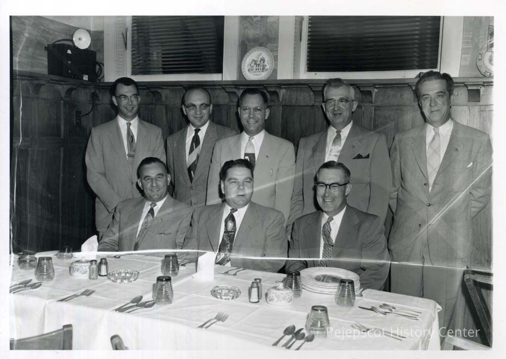 Eight men, Kiwanis Officers, pose behind a banquet table. Sitting in the center is Alva Luce and standing on the left in back are Fred Lewis (?) and Mario Tonan.