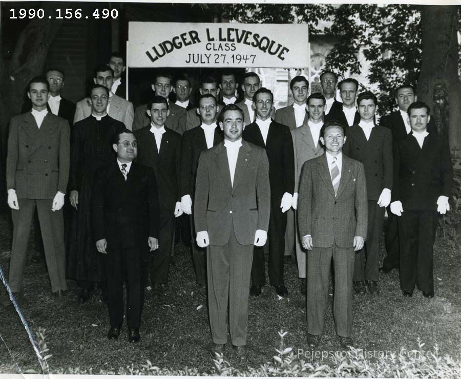 A B/W photograph of Knights of Columbus 3rd Degree Class. Row 1- Ludger Levesque, George Lebourdais; behind Lebourdais, Doiron, next Fred Pinette; left is Regis Fortin Row 2- Roland Devine, Richard Baribeau, George Levesque; Phil Desjardin. 7/27/1947Collection