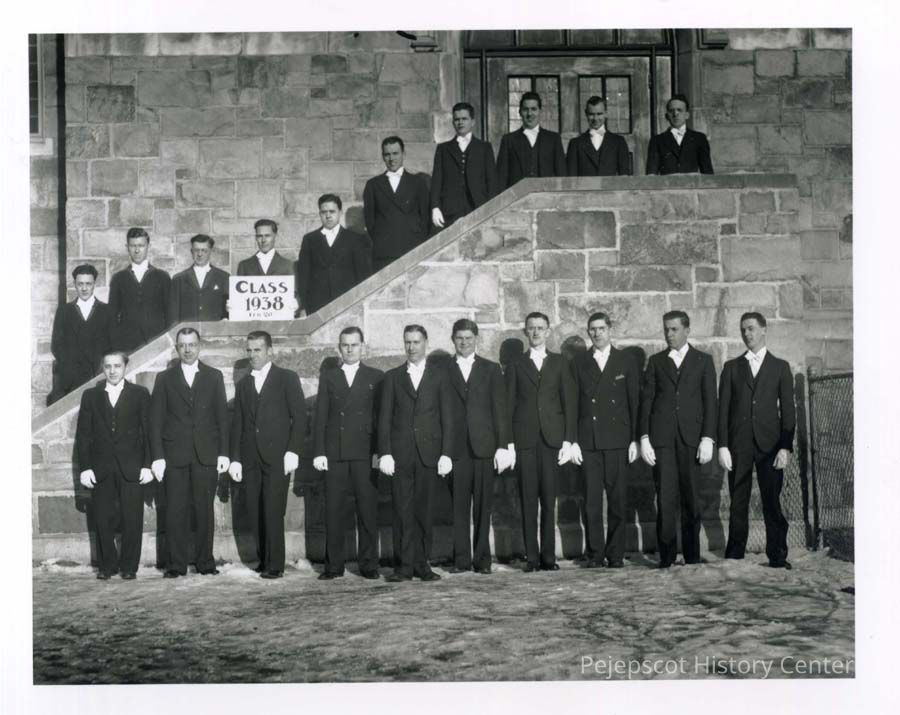 B/W photo of a group of 10 young men standing on the steps of St. John's Church and 10 young men standing on the ground in front of them; one man on steps is holding a sign, "Class of 1938" - Third Degree - K of C.