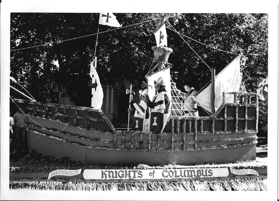 A B/W photograph of the Knights of Columbus float in Brunswick's 250th Anniversary Parade. 10/07/1989