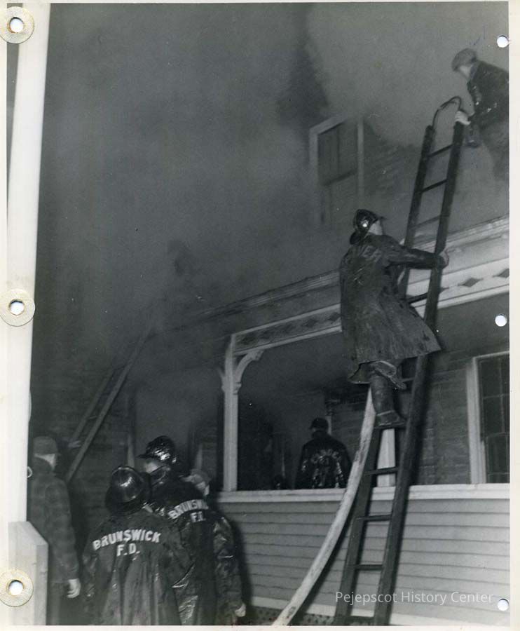A black & white photograph of a fire at the Knights of Columbus Hall on Mason Street, Brunswick, ME. Firemen can be seen scaling the house on ladders and looking onward from the ground. Dated November 5, 1941.
