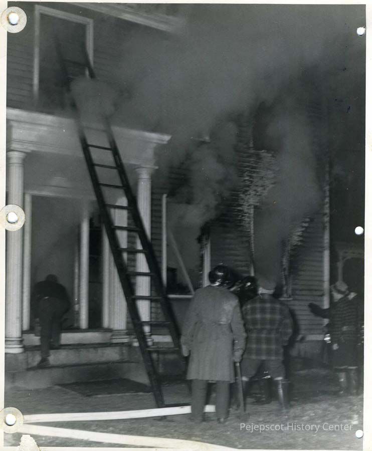 A black & white photograph of a fire at the Knights of Columbus Hall on Mason Street, Brunswick, ME. Firemen are standing in the foreground looking towards the fire. Dated November 5, 1941.