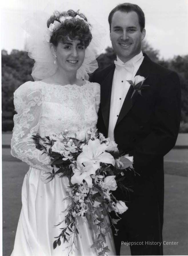An undated black and white wedding photo of Kristen Kenherz and Jeffrey Bartlett.