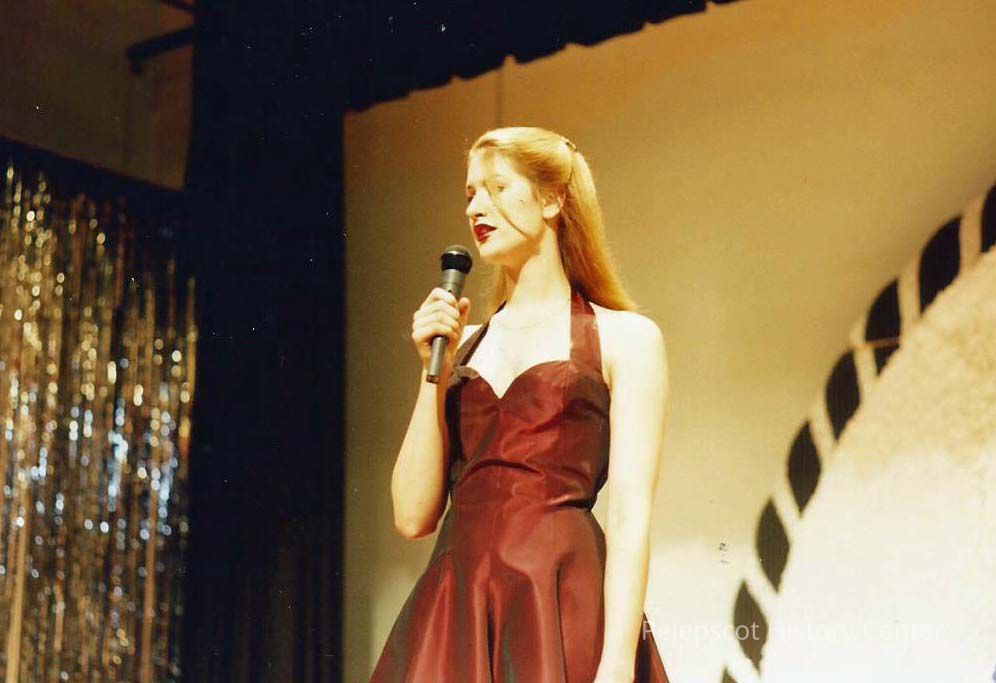A color photograph of Kristen Stevens singing "Hopelessly Devoted to you" for talent. Photographers # 3-16 CYO sponsored