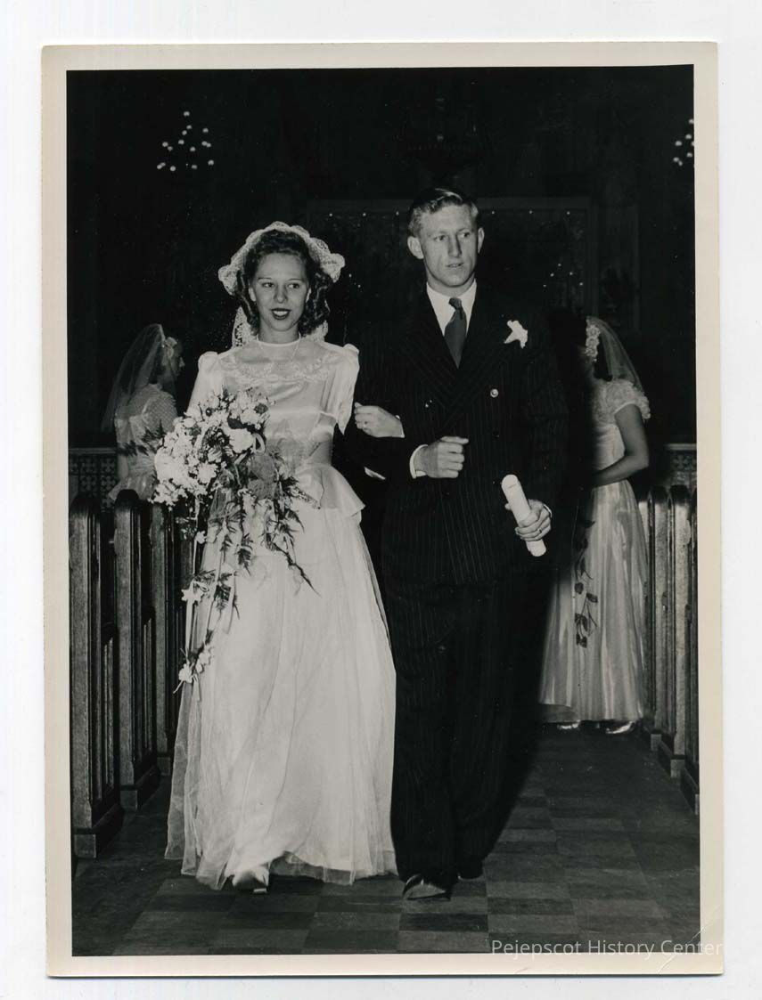 Louise Juliette Lachance and Rodolphe Gerard Saindon walking down the aisle at their St. John's Church wedding. 07/09/1946