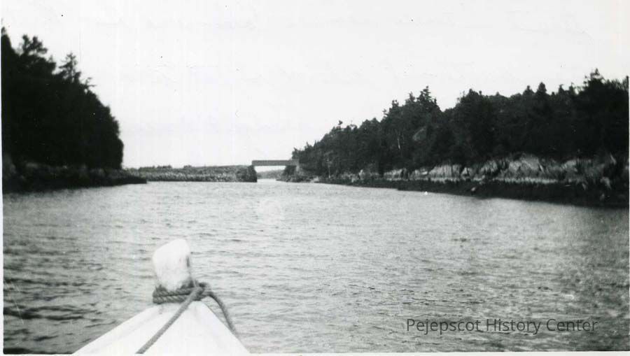 A black and white photo of the strait between Lambas Hole and Gun Point Cove on the western side of Great Island (Sebascodegan) where the bridge and causeway connect Great Island with Orr's Island, Maine. Taken from a boat, the bow of which is just visible. Undated.