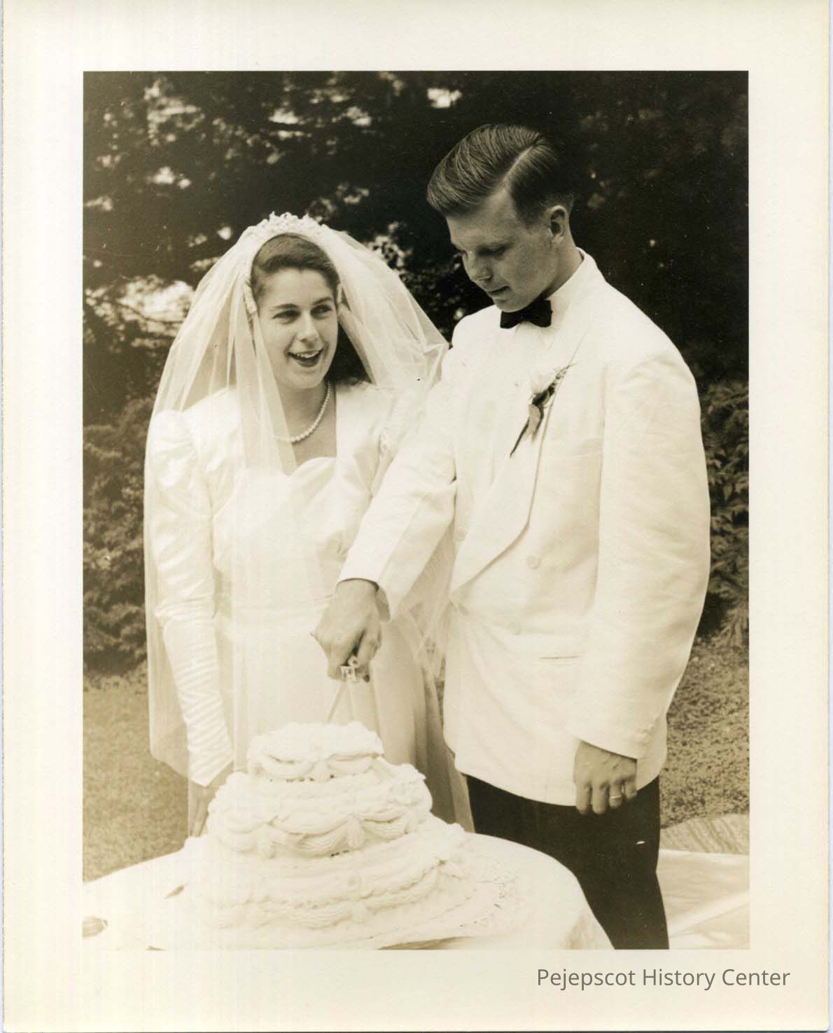 Laura Lane and Edward Reticker cutting their wedding cake. They lived in Files Cottage on Mere Point. 8/09/1947