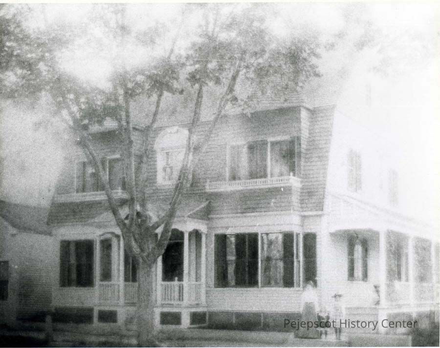 An undated black and white photo of the Larkin D. Snow residence, which stood at 28-30 Pleasant Street, Brunswick before 1930. The site is now the Brunswick Post Office. The little girl pictured in the photo was Helen Snow, who died in 1982 while in her 90s.