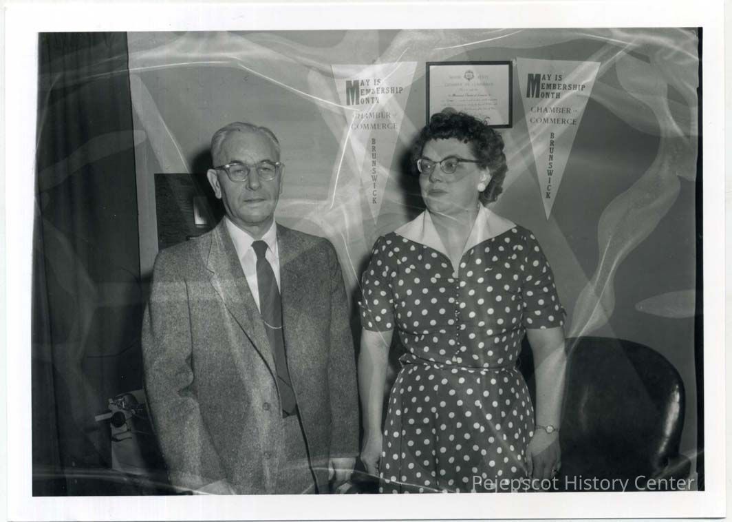 Larry M. Hess and Mrs. Merle Norton pose in front of "May in Membership - Chamber of Commerce" banners and a framed certificate.