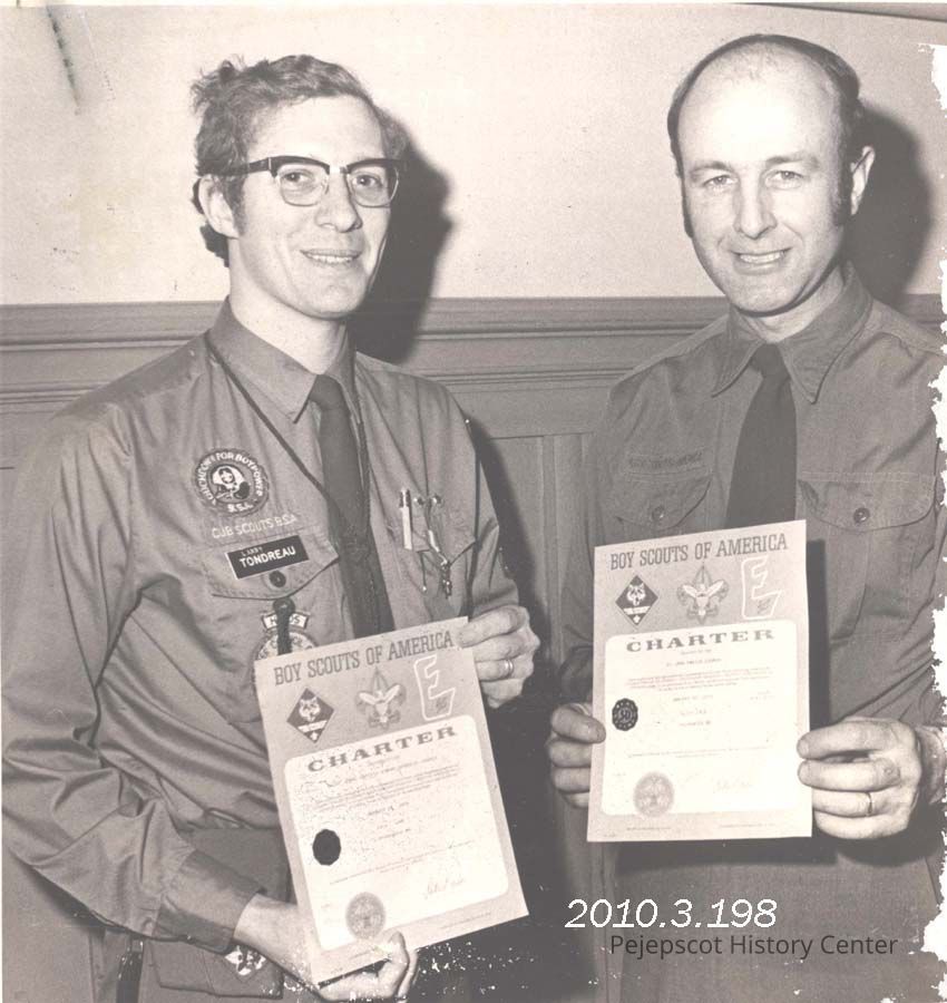 A B/W photograph of Larry Tondreau and Paul Coulombe accepting charters for their scout troops. Photo published 4/17/1973. Undated
