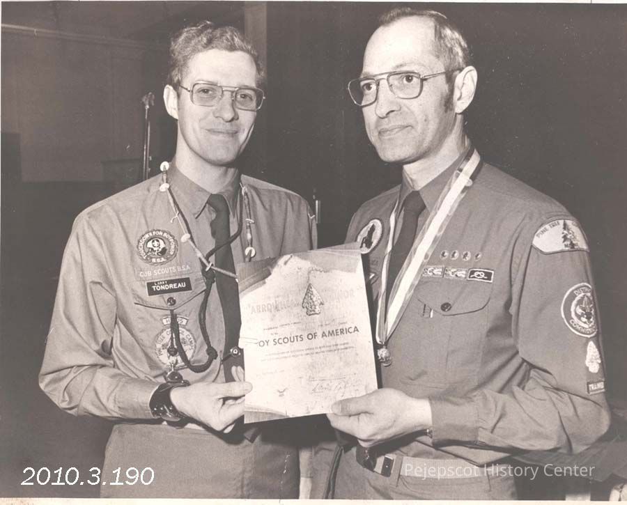 A B/W photograph of Larry Tondreau receiving an award for his work with Cub Scouts. Photo published 3/8/1974. Undated