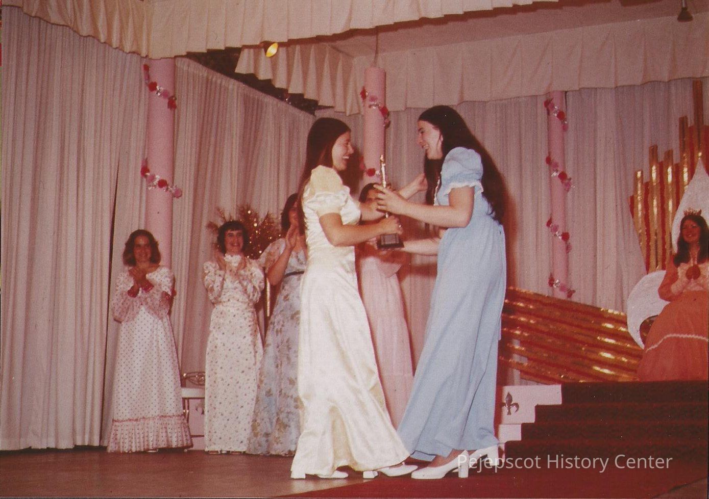 Last year's winner of Miss Congeniality Linda Hinckley presenting the trophy to this year's winner Jane Thiboutot Contestant #6.Collection