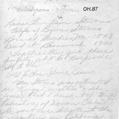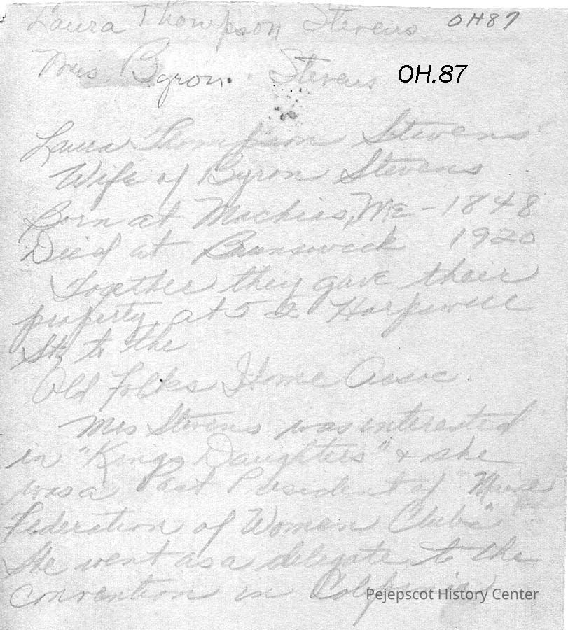 Laura Thompson Stevens, Wife of Byron S. Stevens, born in Machias, ME -- 1848, died in Brunswick, ME -- 1920. Together they gave their property at 52 Harpswell Street to the Old Folks Home Association. Mrs. Stevens was interested in "Kings Daughters" and she was a Past President of "Maine Federation of Women Clubs". She went as a delegate to the convention in California