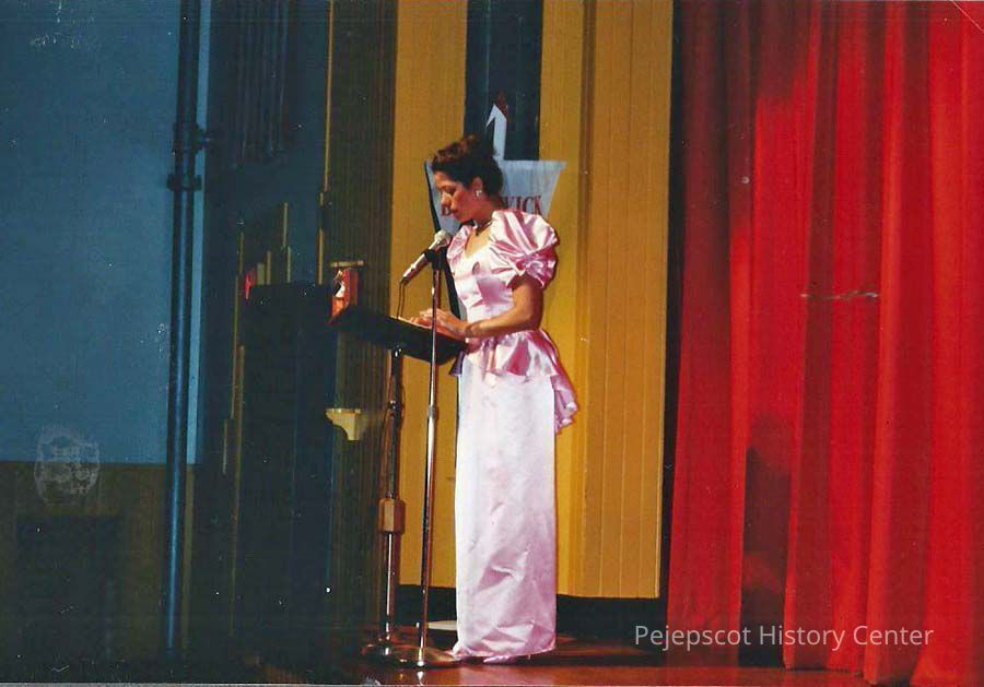 A color photograph of Laurie Deschene introducing herself as second half M. C.. CYO Sponsored
