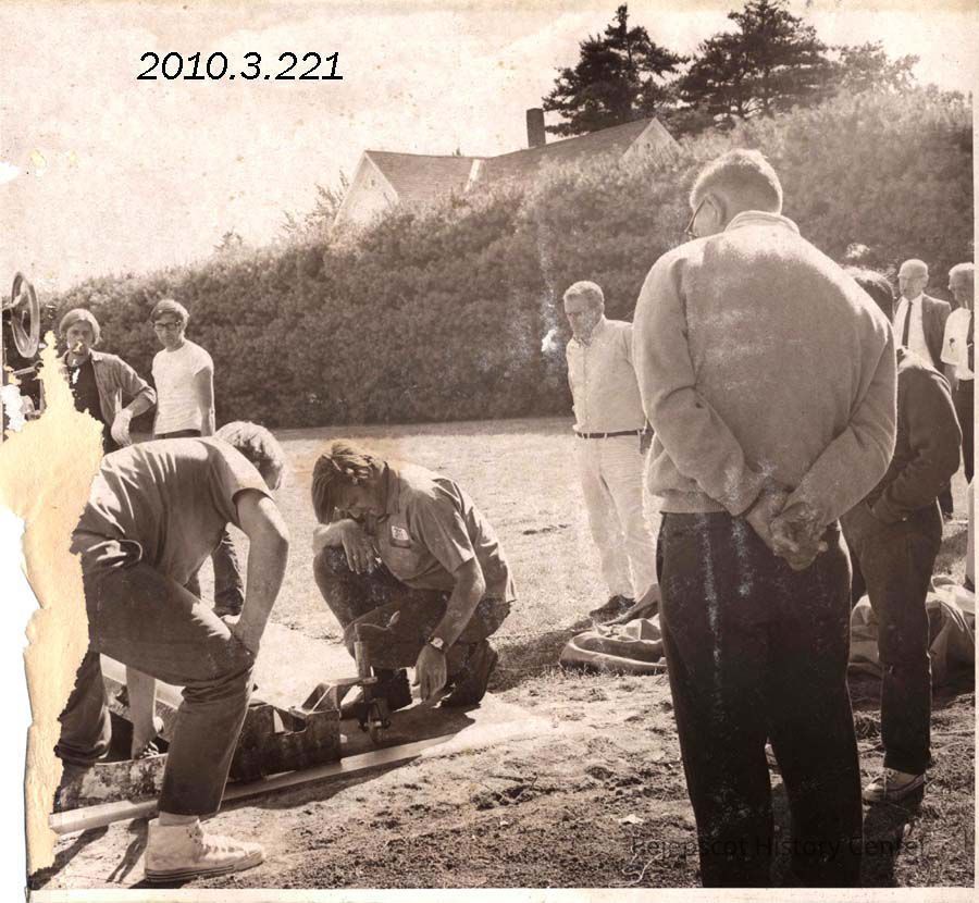 A B/W photograph of laying the all weather Tartan Track at Bowdoin's Whittier Field. Photo published 9/3/1970. Undated