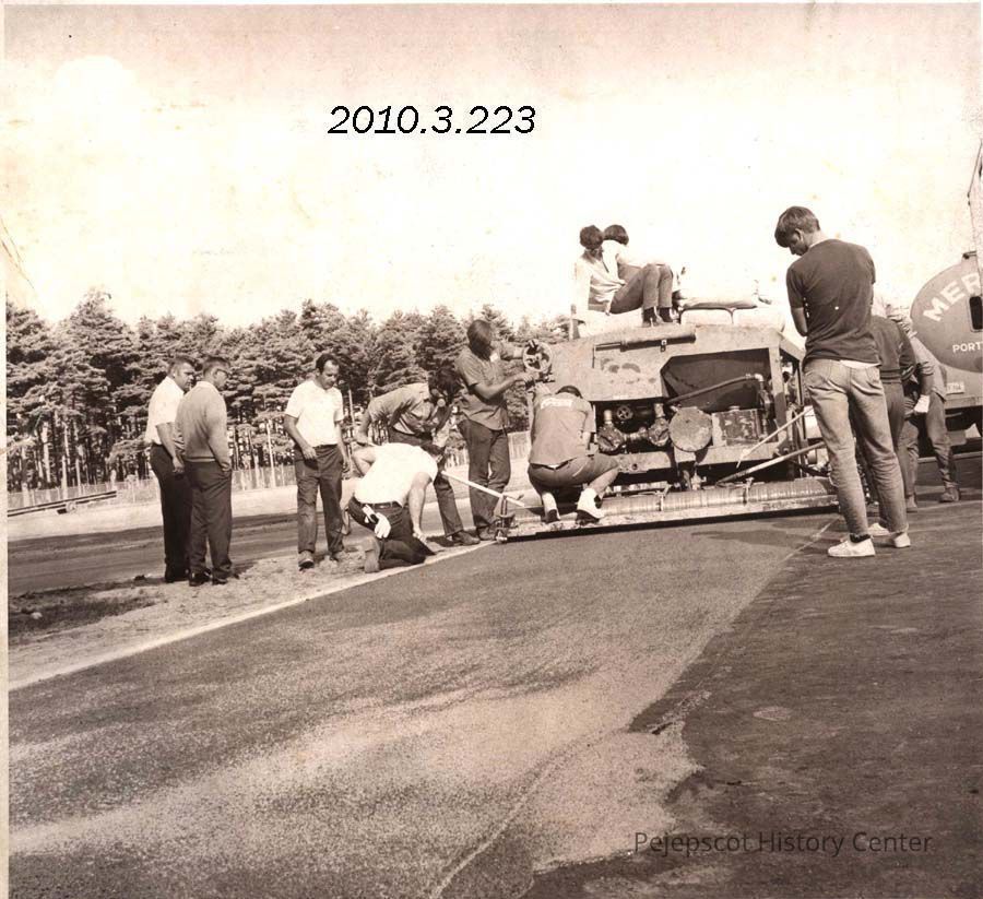 A B/W photograph of laying the all weather Tartan Track at Bowdoin's Whittier Field. Photo published 9/3/1970. Undated