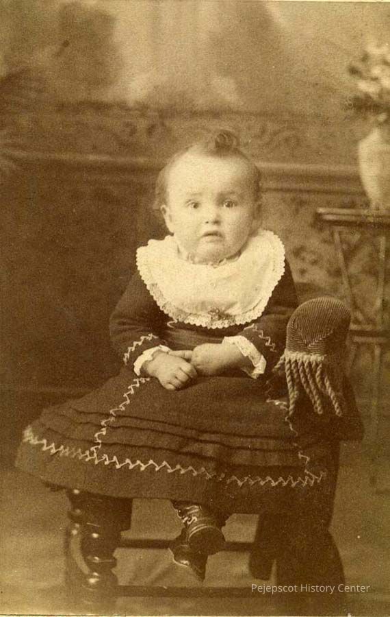 A sepia-toned photograph of a small child sitting on a chair, identified as Lea R. Hussey. Undated.