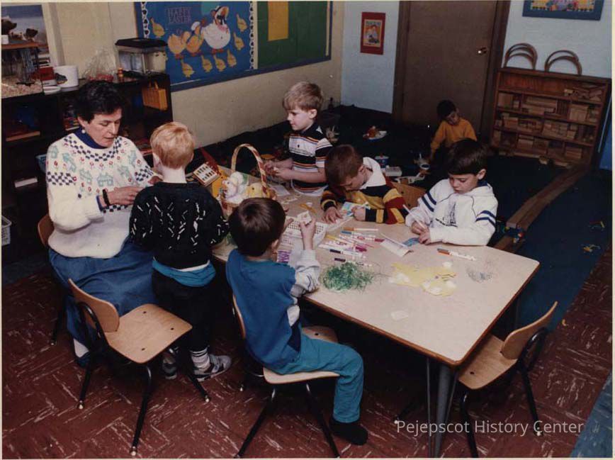 A colored photograph of Margie Miller and students at the Learning Land School in Brunswick, ME working on an Easter craft project. Five students at a table are accompanied by an array of colored markers, paper, stickers, and other materials to make crafting engaging for all. This photo was published in the Times Record newspaper on 04/24/1992.