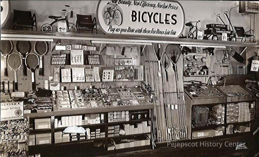 A B/W photograph of a display at Leathers Department store. It shows a display of fishing gear.
