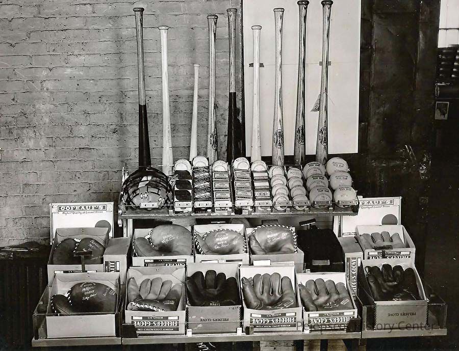 A B/W photograph of Leathers Department store's exhibit of baseball gear.