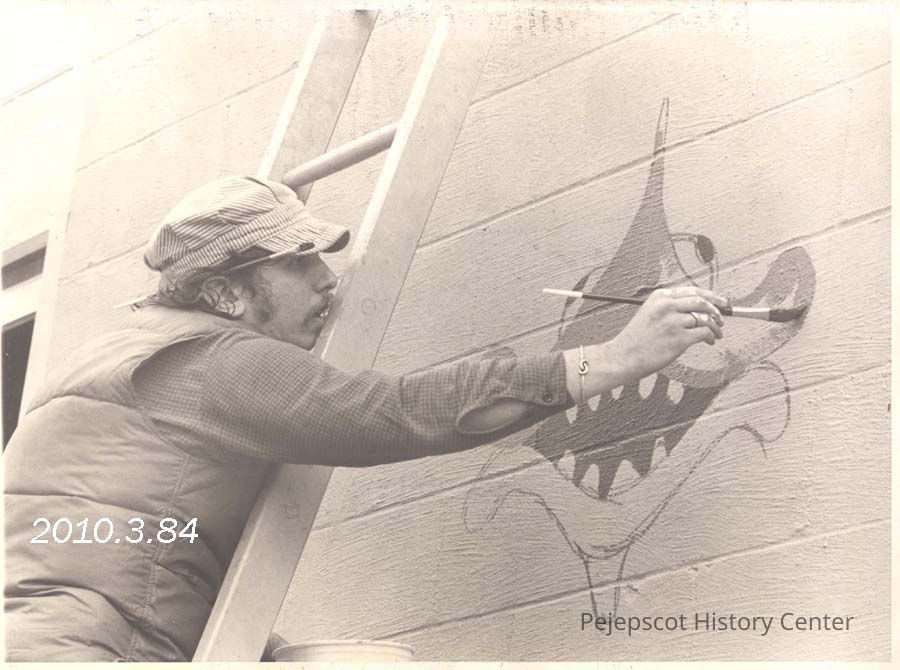 A black and white photograph of Lee Frinsko, a Saco mural artist, painting on the outside wall of the World of Pets shop on Pleasant Street. Brunswick. Frinsko is painting an animated shark with somewhat of a smile. Photo published in the Times Record on 04/29/1977. Undated