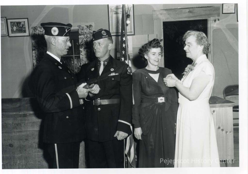Four Legionnaires stand facing one another. The men are in uniform and are passing a gavel. The women are in formal dress.