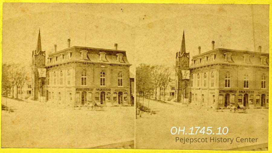A stereo view photo of Pleasant Street showing the Lemont Block and the Methodist Church, Brunswick, ME. Published by B. G. Dennison. Not dated.