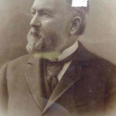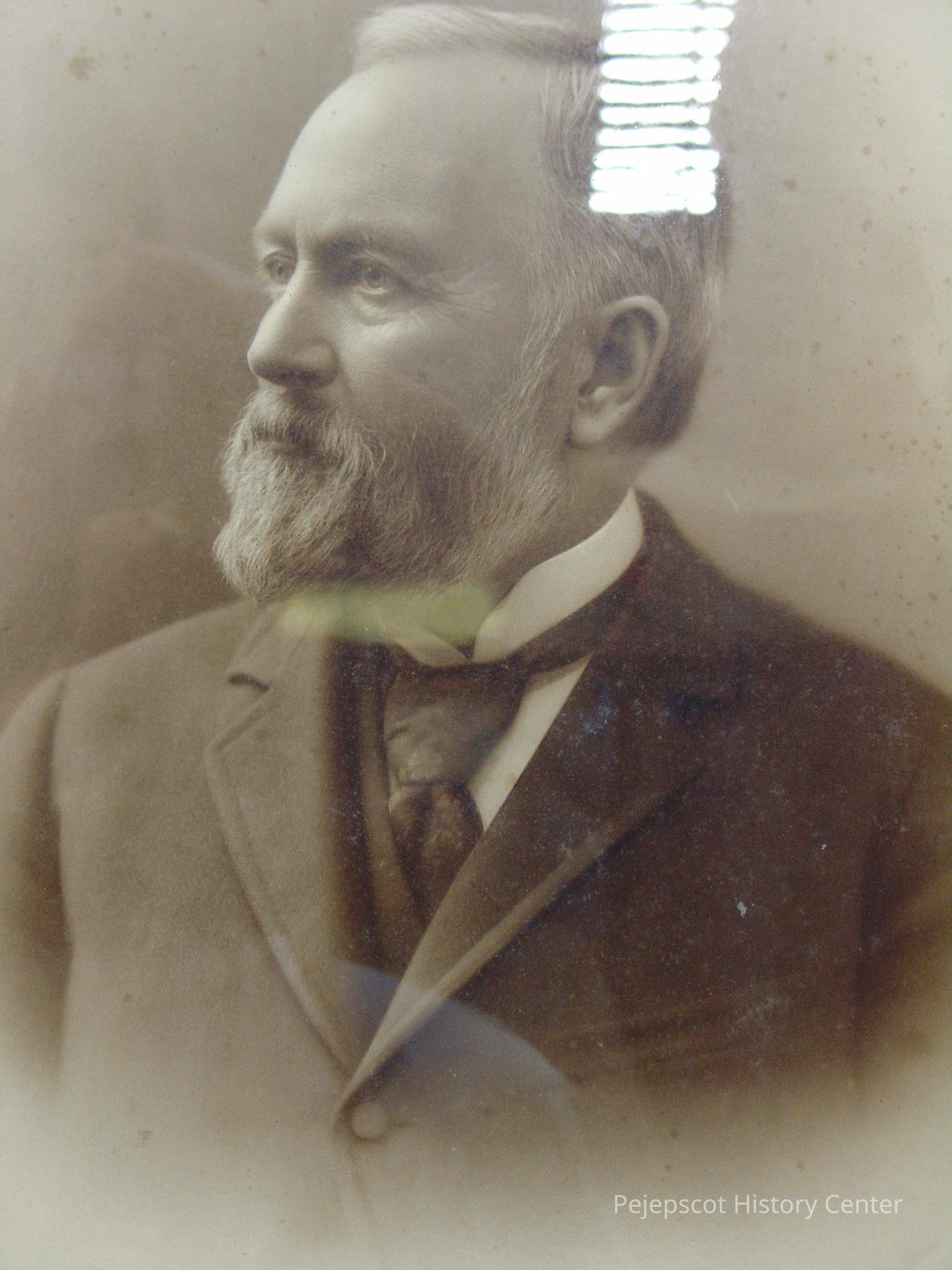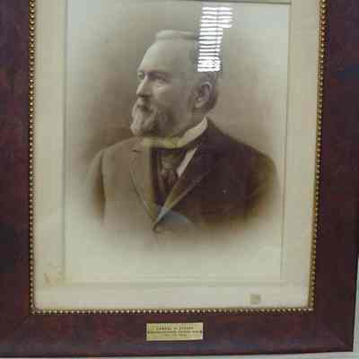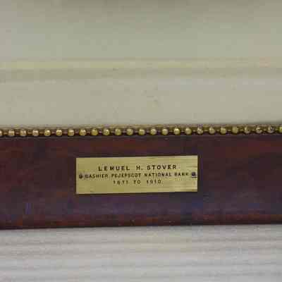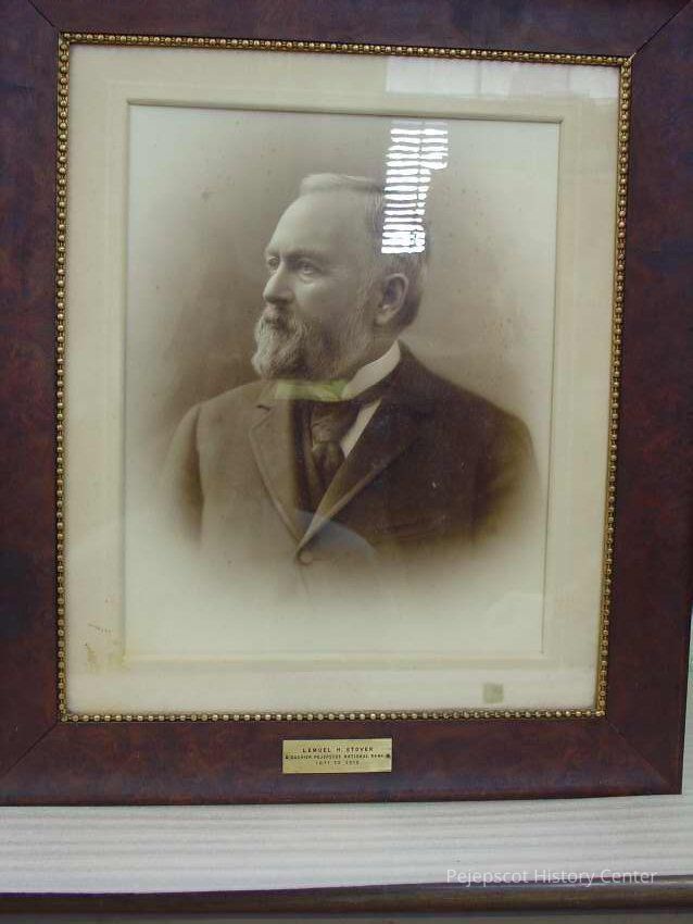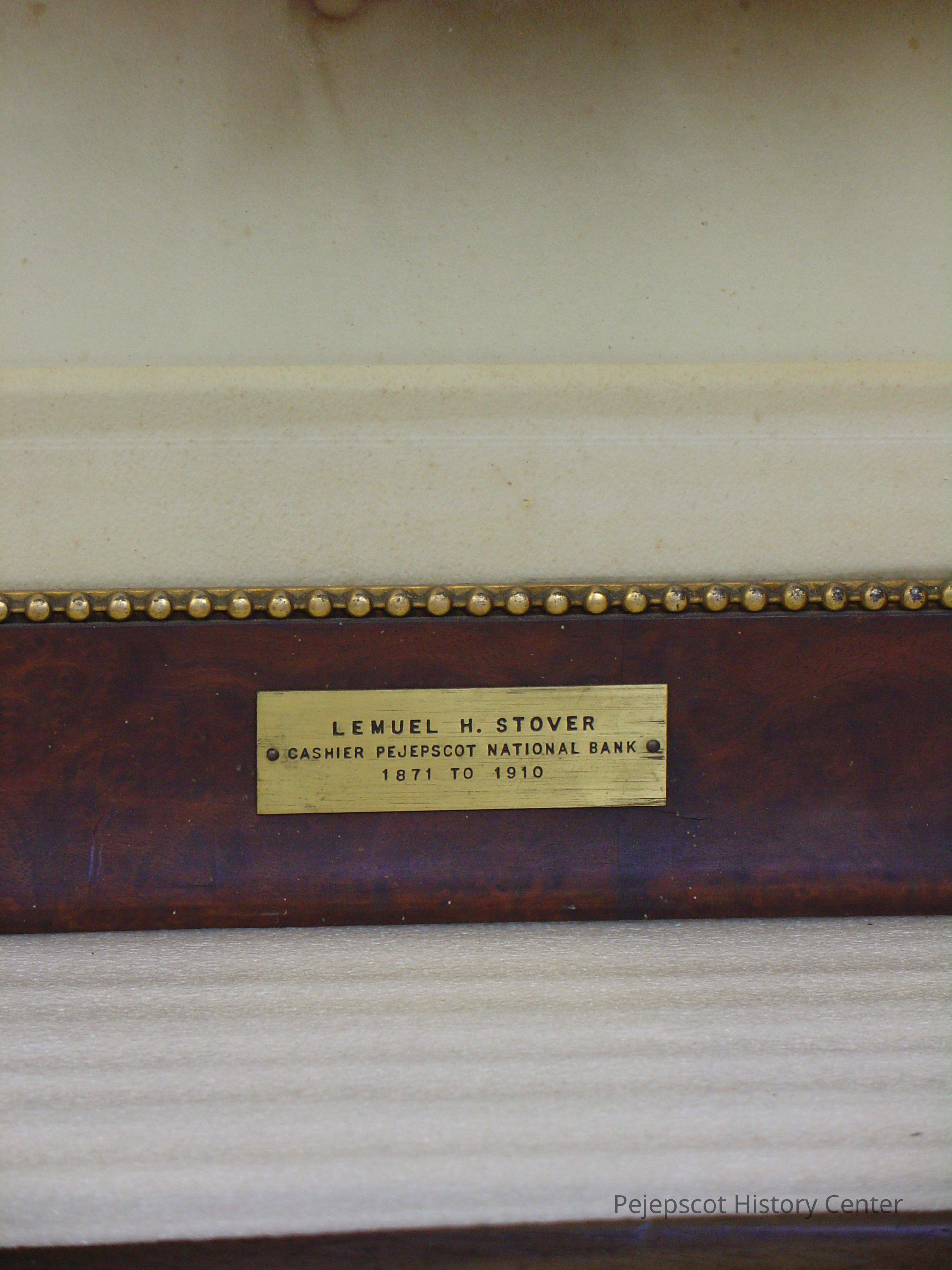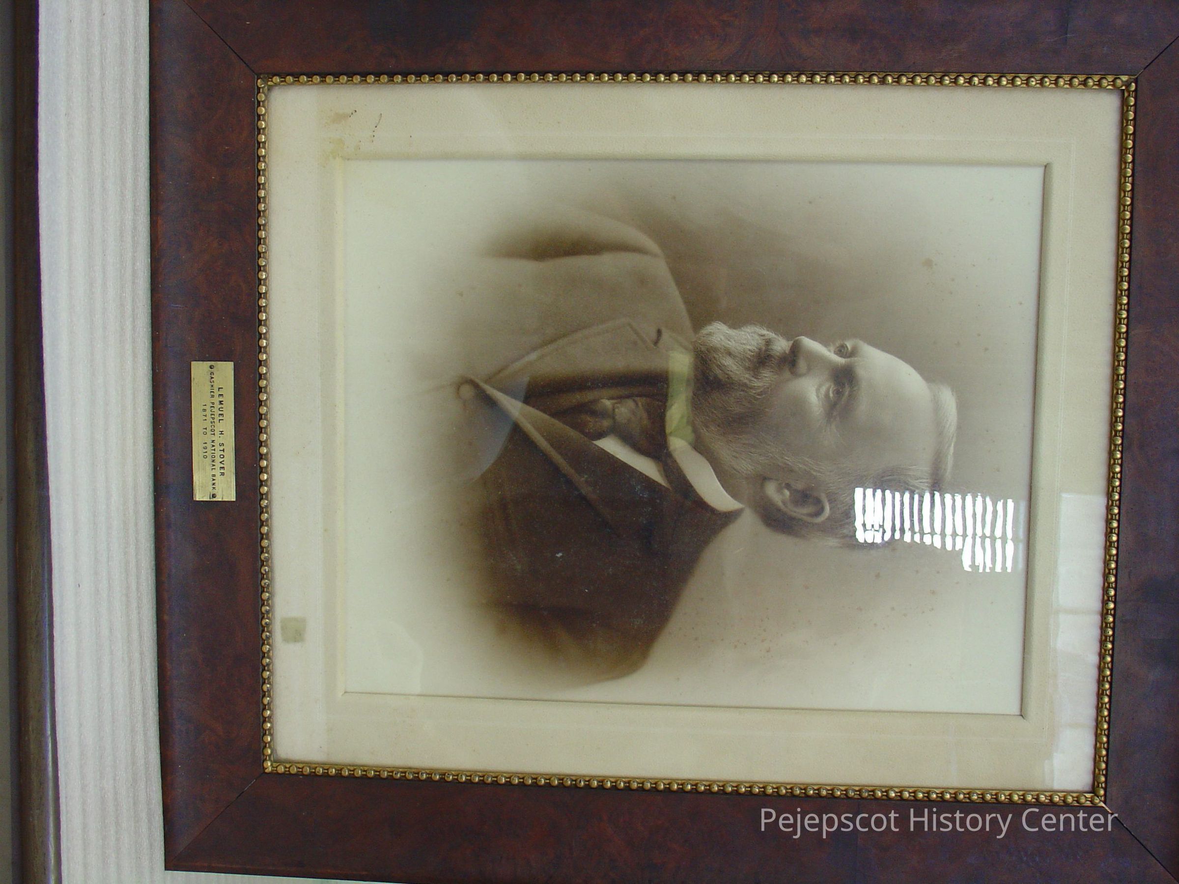 Framed, matted B&W photo of Lemuel H. Stover. Glass covered, brass plate on bottom center part of frame with his name and, "Cashier Pejepscot National Bank 1871 - 1910. The frame is of burl wood with a gilt molded plaster inner edge with a bead design. Overall size: 76.5 cm h x 66.25 cm w x 2.25 cm d. Photo not dated.