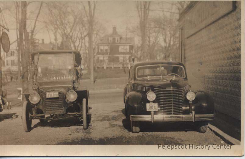 Postcard of Leon H Kelley garage, 212 Maine Street, Brunswick, Maine. According to a note on the back of the card, the two cars are Studebakers. Park Row is visible behind the Mall in the postcard's background.