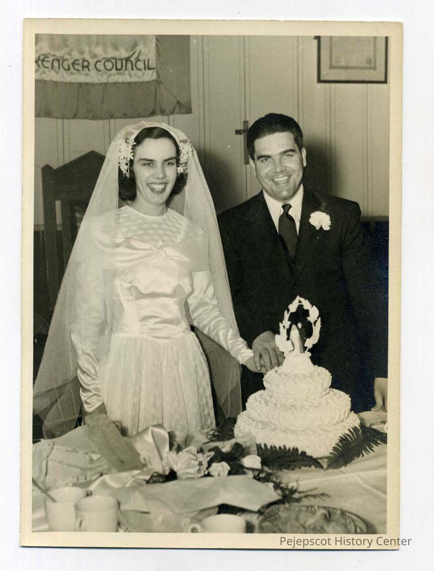 Bride and groom, Melanie Ceclie LeTarte and Leo Thomas Tetu, cutting the cake at their wedding reception at St. John's church. Unverified: Married 03/02/1946