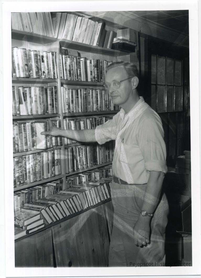 Lewis H. Palmer, stand in front of a book shelf in his book store.