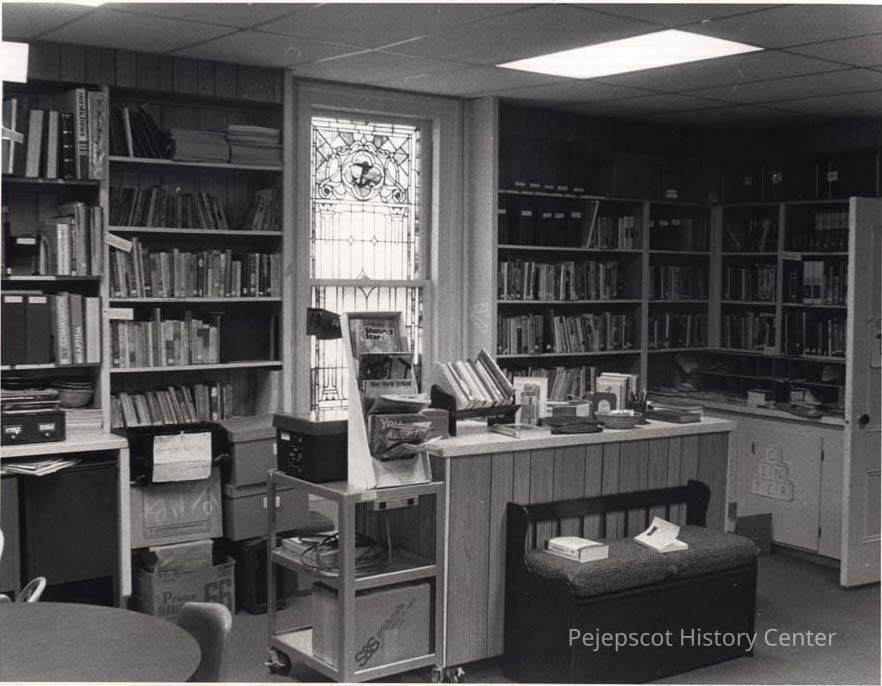 A B/W photograph of the library at the United Methodist Church. Undated