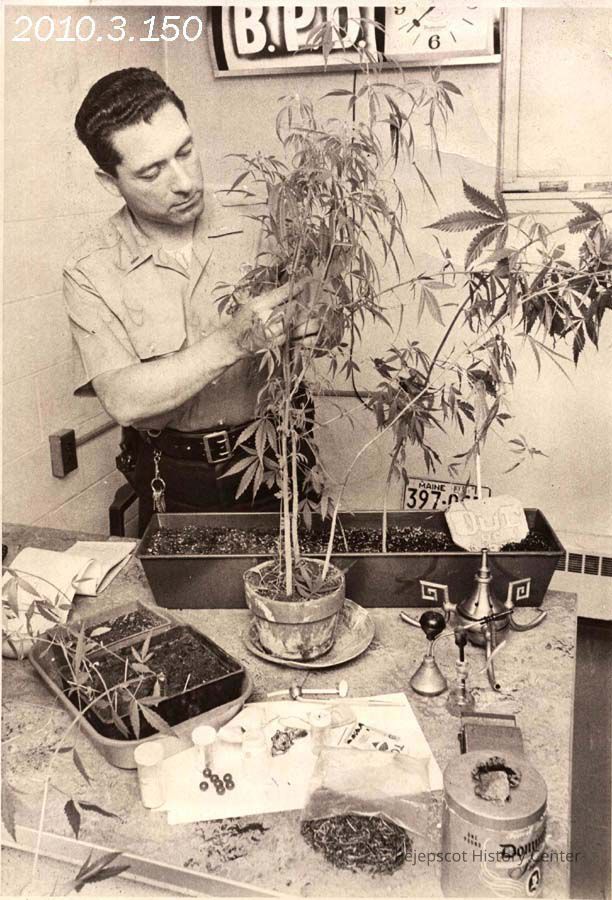 A B/W photograph of Brunswick Police Lieutenant Larry Joy with a marijuana plant and drug paraphernalia following a local arrest. Undated