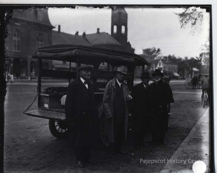 Photo of a lightning rod vendor on Maine Street near Town Hall, Brunswick, Maine.