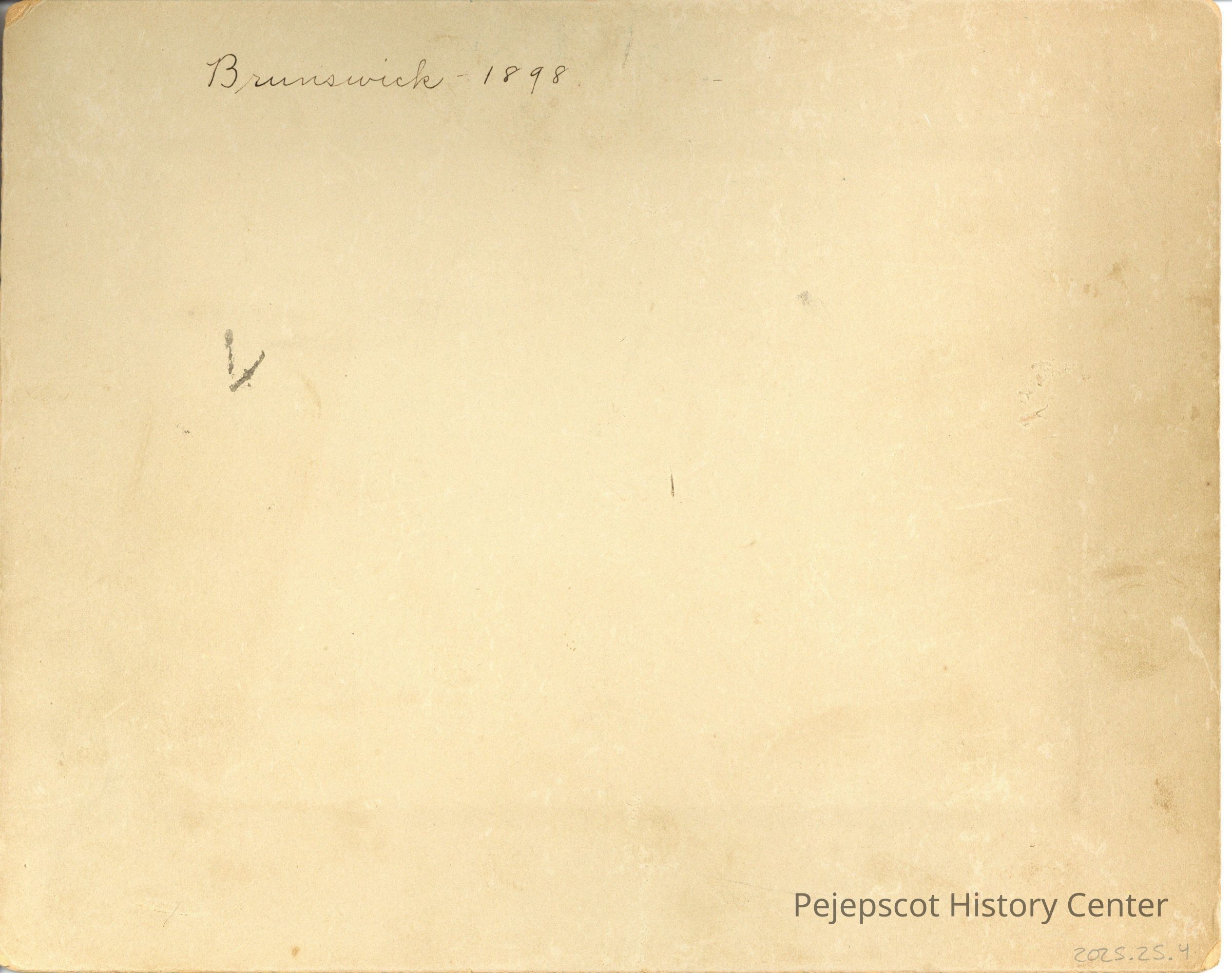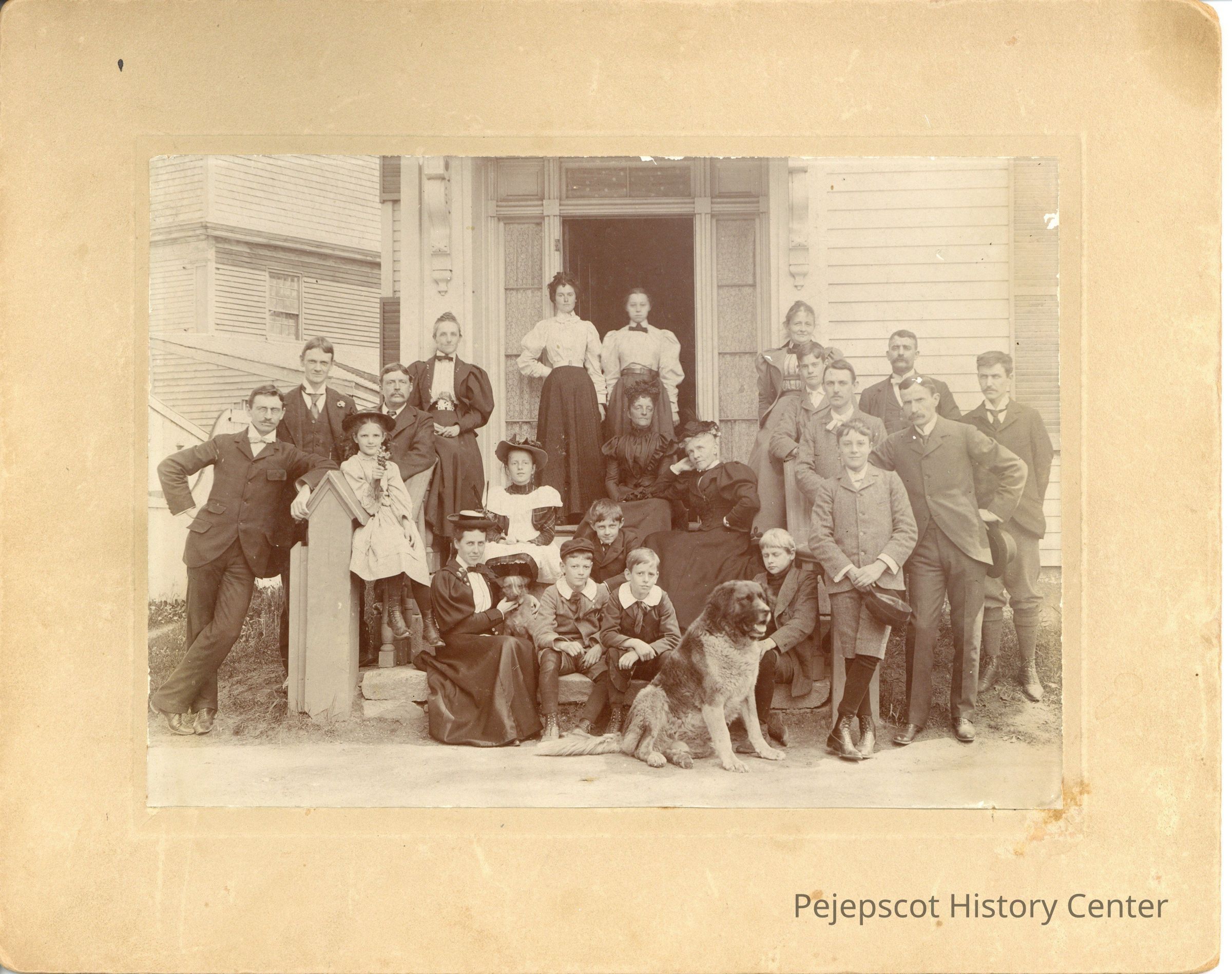 Black and white matted photograph of Lillian Wallace Gould (1881-1964) and 21 unidentified people taken in Brunswick in 1898. Lillian appears to be standing at the center back in the open doorway.