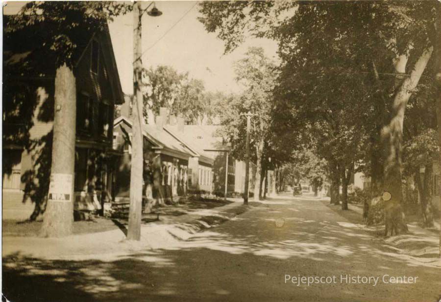 An undated black and white photograph of Lincoln Street looking towards Maine Street from Union Street in Brunswick.