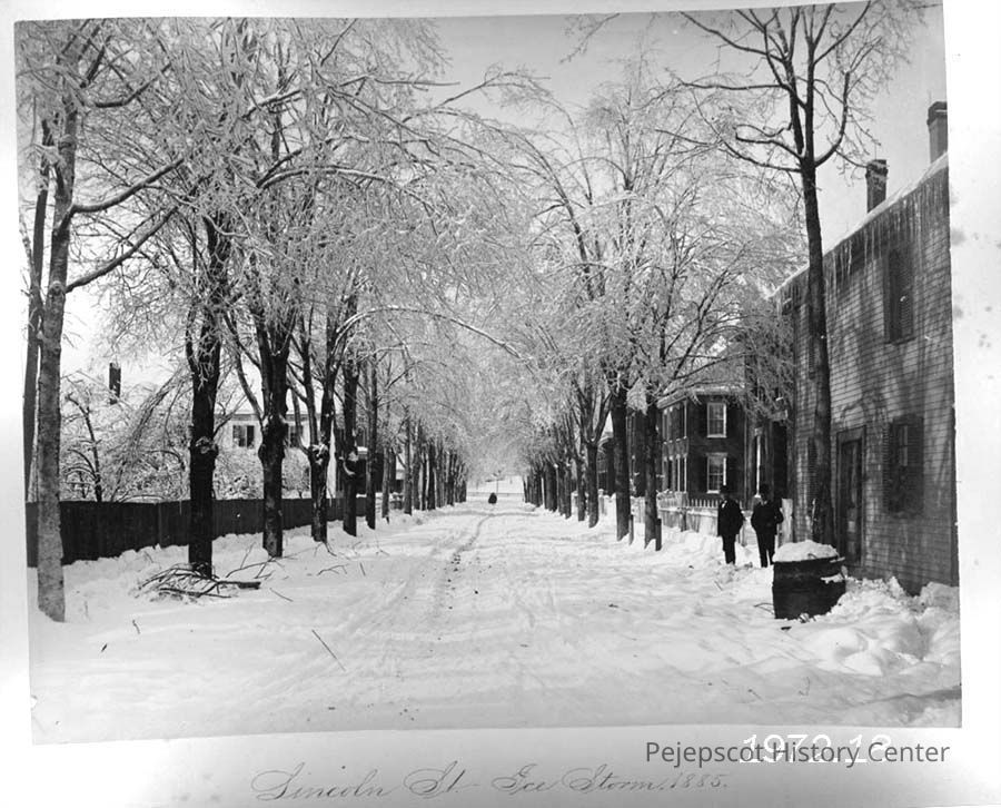 A B/W photo of Lincoln Street, Brunswick, ME after an ice storm. The road and trees are covered in snow. Men are standing on the right side of the street. There is a horse and sleigh in the distance. From an album entitled "Views of Brunswick and Vicinity". Labeled "Lincoln St. Ice Storm 1885”. Dated 1885.