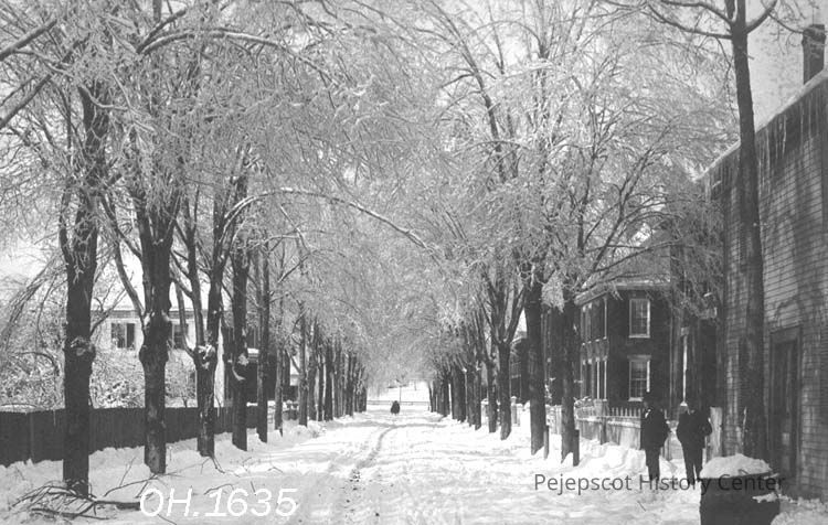 A B/W photo of Lincoln Street, Brunswick, ME after an ice storm. The road and trees are covered in snow. Men are standing on the right side of the street. There is a horse and sleigh in the distance. Dated 1885.