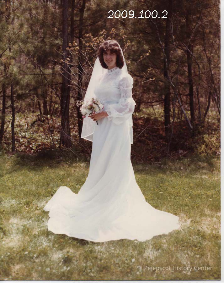 Linda Marie Letarte in wedding dress (2009.100.1). 5/20/1978 Linda Marie Letarte (b. 11/16/1955) and Michael Paul Page (b. 9/22/1952) were married at St. Charles Borromeo church by Rev. James Knox (Grooms cousin).