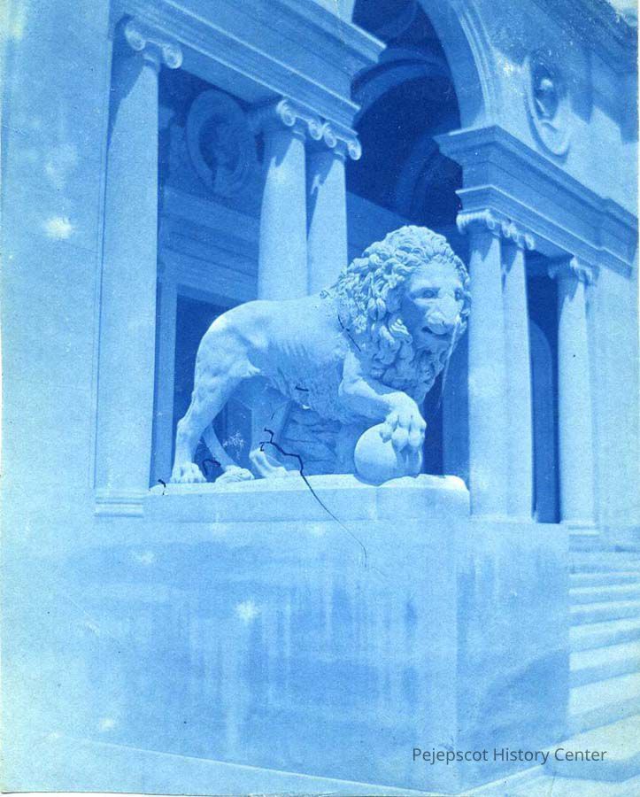 Blue finish photograph,vertical view of the stone lion to the left of the steps of Walker Art Museum at Bowdoin College (part of facade).