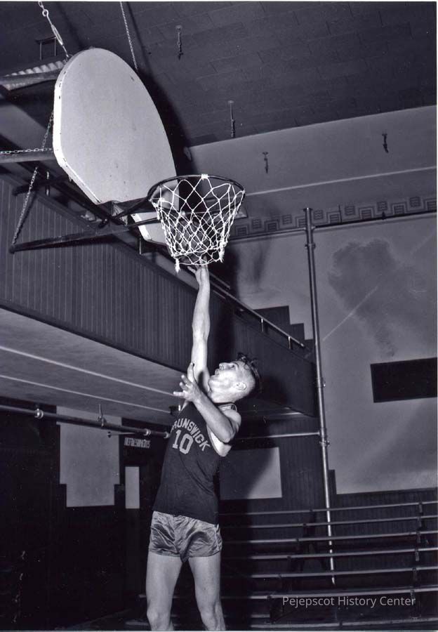 Black & white photograph (from negative) of Lionel Bourque '57, Brunswick High School basketball player at a 1954 game making a basket.