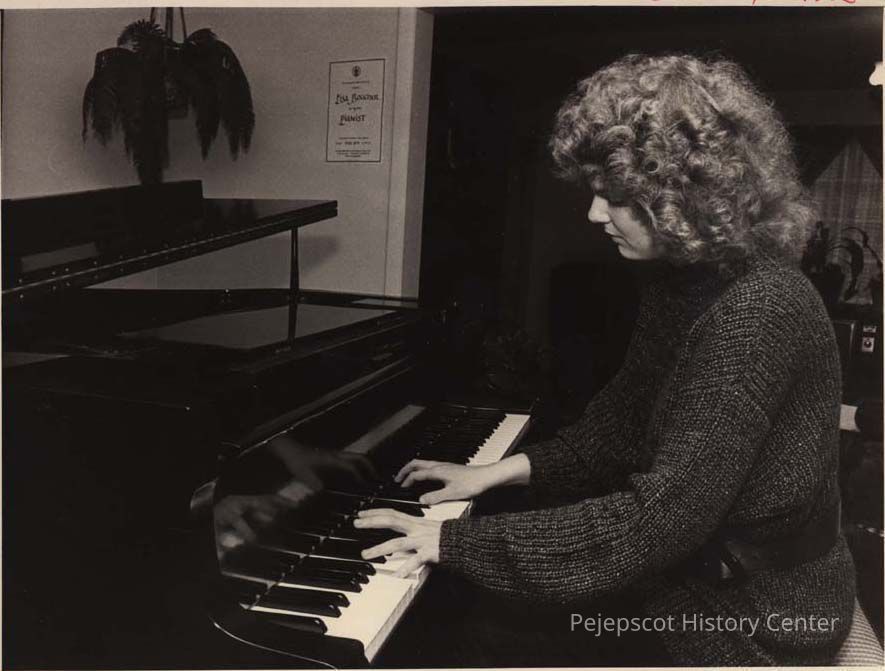 An undated black and white photo of Lisa Boucher playing the piano.