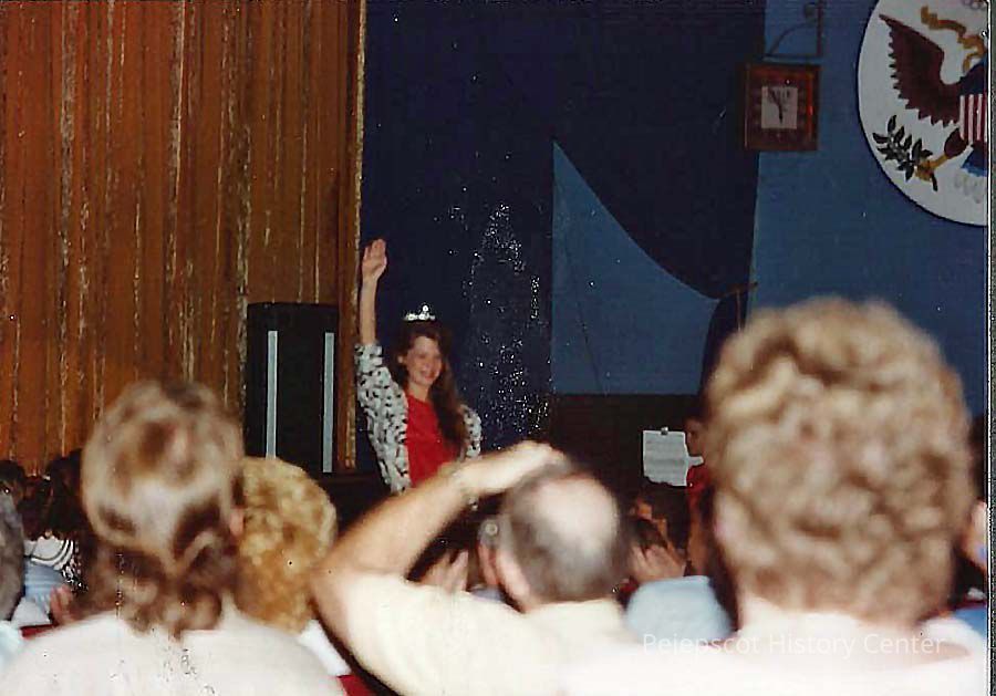 A color photograph of Lisa Kelly 1988 BTQ (Brunswick Teen Queen), being introduced at the Maine Egg Festival Pageant 7/22/1988.