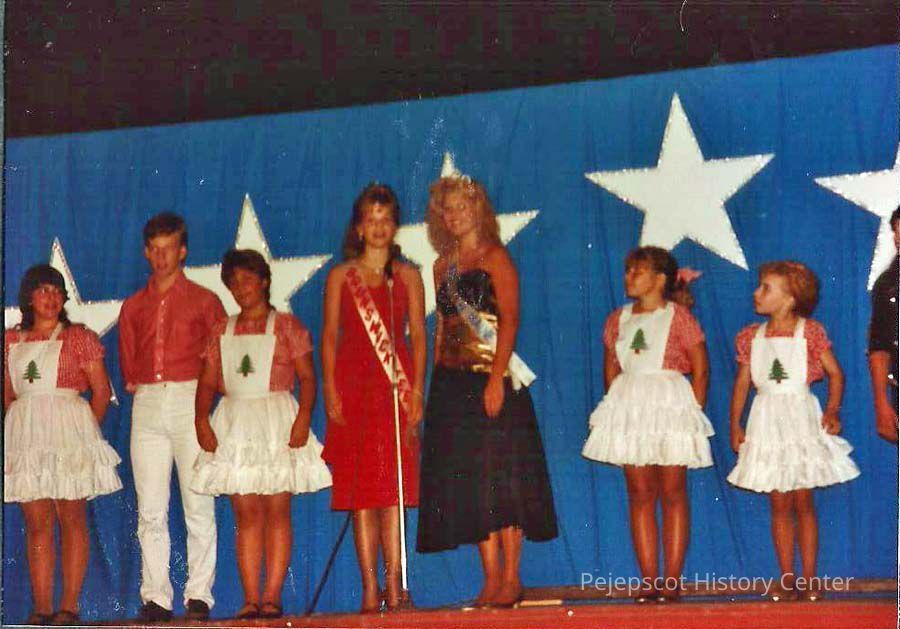 A color photograph of Lisa Kelly and cast doing a closing number at the Topsham Variety Show. 8/13/1988