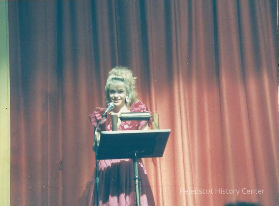 A color photograph of Lisa Kelly as MC of the 1990 Teen Queen Pageant.